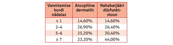Selgus, et atoopilise dermatiidi risk kolme kuu vanuses oli märgatavalt suurem lastel, keda vannitati sagedamini kui üks kord nädalas, võrreldes lastega, keda vannitati harvem (kohandatud šansisuhe 1,69).