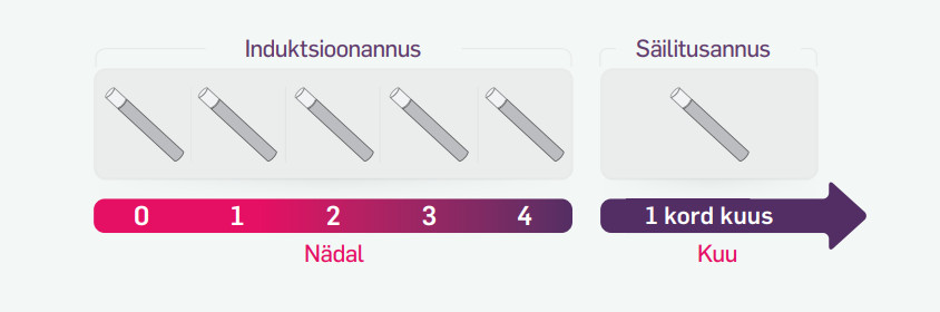Esimesed annused süstitakse nädalatel 0, 1, 2, 3 ja 4, seejärel jätkatakse 1 kord kuus säilitusannusega1.