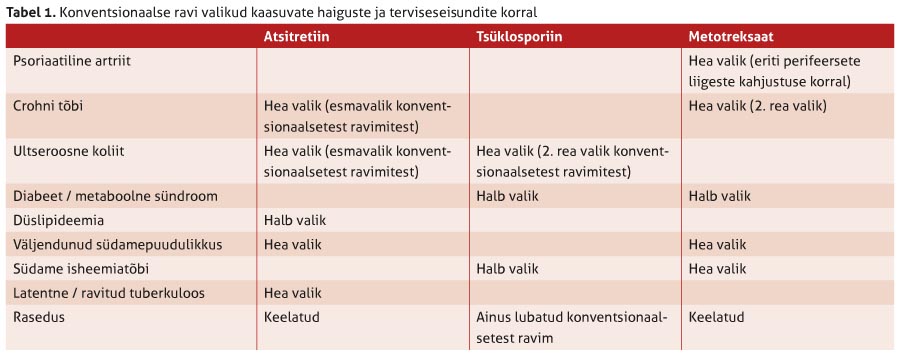 Konventsionaalsetest ravimitest on psoriaasi ravis kasutusel atsitretiin, metotreksaat ja tsüklopsoriin. Metotreksaadi ja tsüklosporiini efektiivsus on võrdne (1, 2).