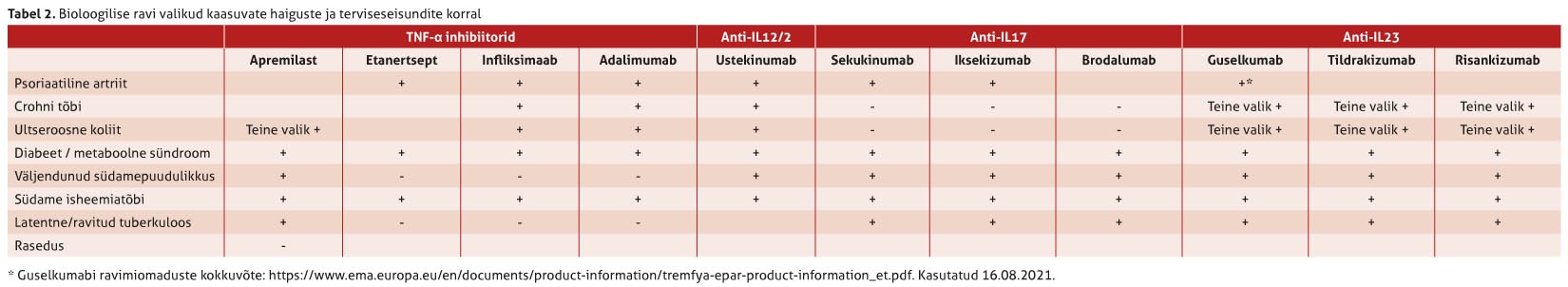 Bioloogilise ravi valikud kaasuvate haiguste ja terviseseisundite korral (vt tabel 2)