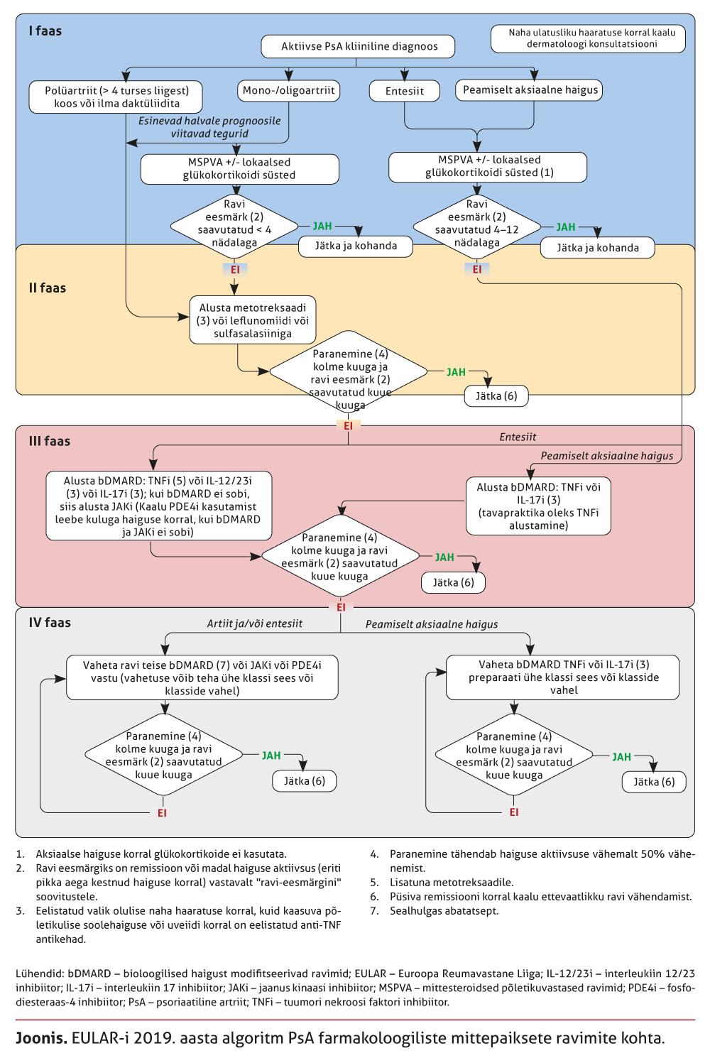6) Perifeerse artriidi ja vähemalt ühe csDMARDi ebaefektiivse kasutamise puhul tuleks alustada bioloogilist ravi, olulise nahahaaratuse korral võiks eelistada IL 17 või IL 12/23 inhibiitorit.