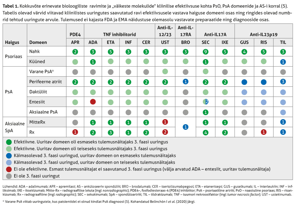 Kokkuvõte erinevate bioloogiliste ravimite ja „väikeste molekulide“ kliinilise efektiivsuse kohta PsO, PsA domeenide ja AS-i korral (5). Tabelis olevad värvid viitavad kliinilistes uuringutes saavutatud ravi efektiivsusele vastava haiguse domeeni osas ning ringides olevad numbrid tehtud uuringute arvule. Tulemused ei kajasta FDA ja EMA näidustuse olemasolu vastavate preparaatide ning diagnooside osas.