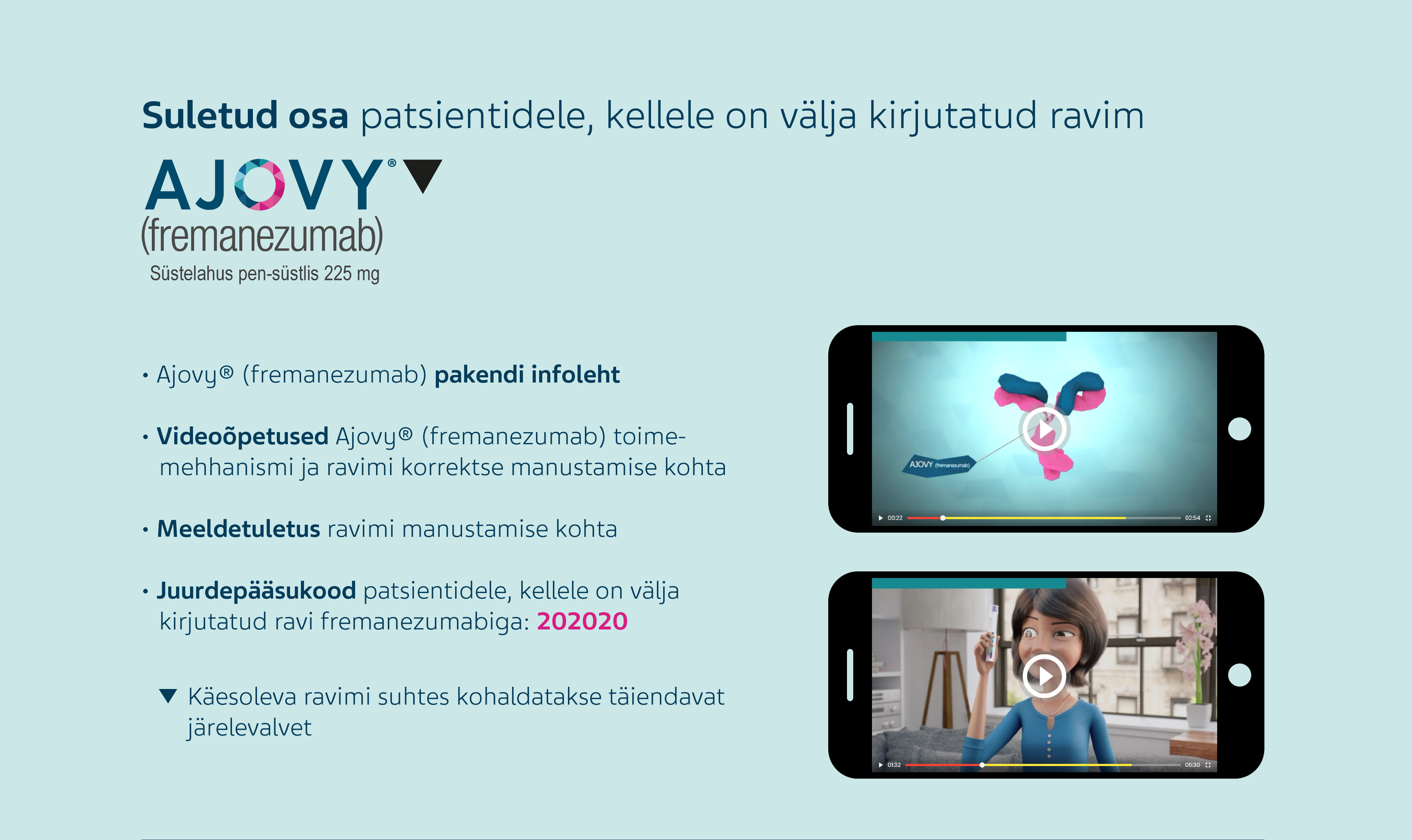 AJOVY (fremanezumab) 225 mg süstelahus pen-süstlis. Retseptiravim. Näidustus: AJOVY (fremanezumab) on näidustatud migreeni profülaktikaks täiskasvanutele, kellel on iga kuu vähemalt 4 migreenipäeva.