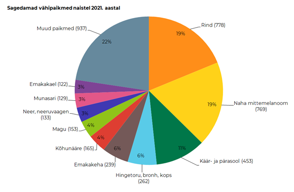 Tervise Arengu Instituudi (TAI) hallatava vähiregistri andmetel diagnoositi 2021. aastal 8224 vähi esmasjuhtu, neist meestel 4084 ja naistel 4140. Meestel esines kõige sagedamini eesnäärme- ja kopsuvähki ning naha mittemelanoomi; naistel rinnavähki, naha mittemelanoomi ning käär- ja pärasoolevähki.