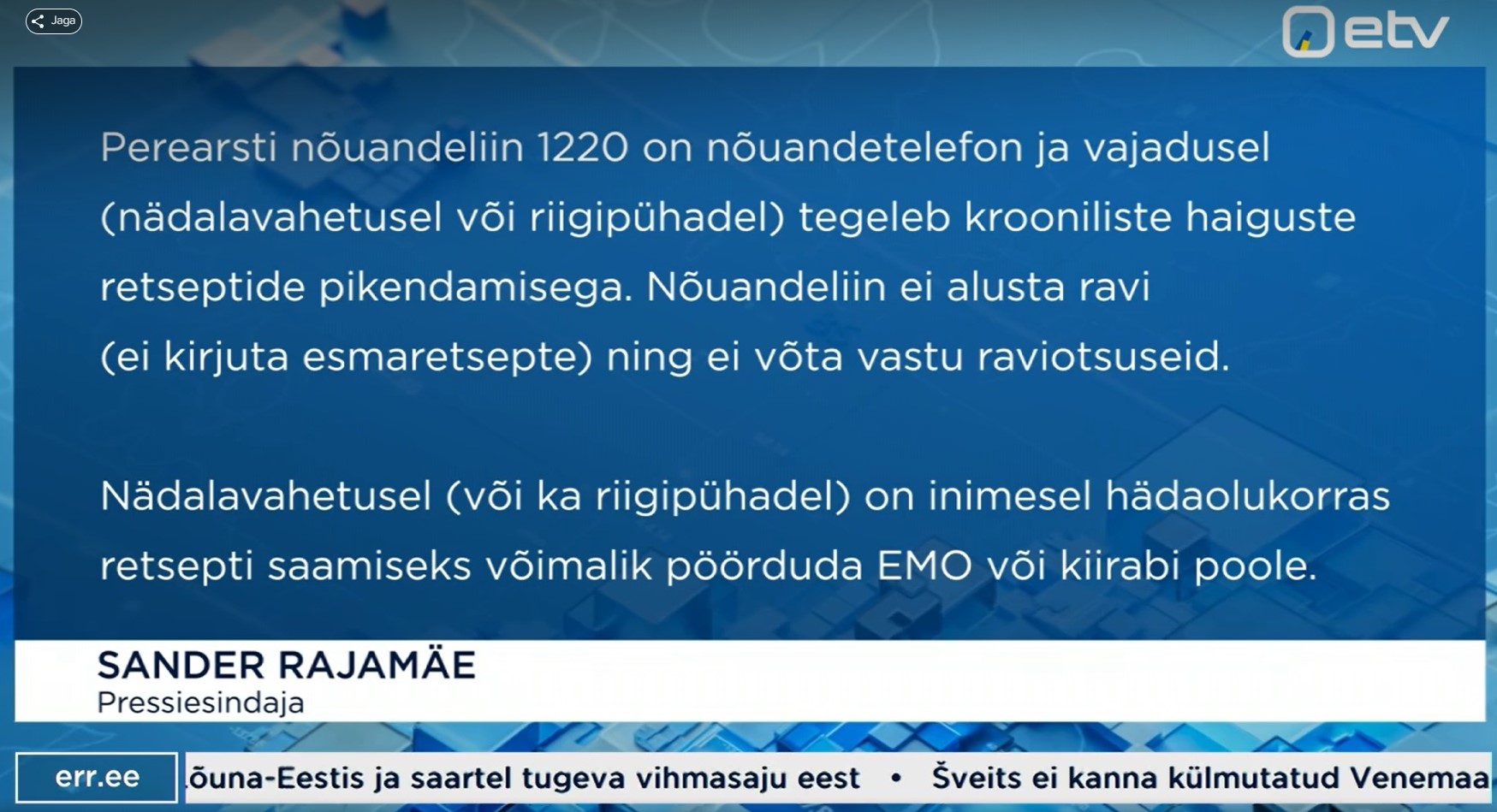 Aktuaalse Kaamera uudislõigus, kus käsitleti teemat, et perearsti nõuandetelefon suunab esmast retsepti küsima tasuliselt numbrilt, teatas Tervisekassa, et nädalavahetusel on inimesel hädaolukorras retsepti saamiseks võimalik pöörduda ka EMO või kiirabi poole. Uurisime, mida arvavad sellisest soovitusest asjaosalised. Tervisekassa pressiesindaja Sander Rajamägi selgitas peale artikli avaldamist, et EMO-sse või kiirabi poole tuleks pöörduda eluohtlikus või hädaolukorras. Kiirabi osas pidas Tervisekassa ERR-ile antud kommentaaris silmas seda, et kui inimesel on päriselt eluohtlik seisund ja tal ei ole võimalik liikuda, on tal võimalik kutsuda kiirabi, kes annab talle esmaabi ning vajadusel viib inimese haiglasse, kus on olemas vajaminev ravim. Tervisekassa selgitusi saab lugeda siit.