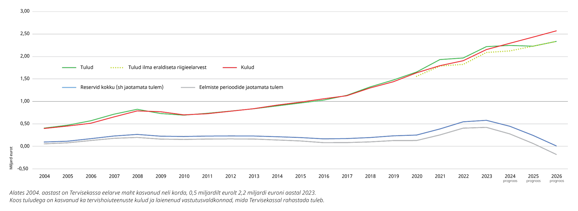 2023. aastal on Tervisekassa eelarve kogumahuks planeeritud 2,2 miljardit eurot. Suur osa Tervisekassa tuludest tuleb tööjõumaksudest (2023. aastal on see ligi 82 protsenti eelarve tuludest ehk 1,8 miljardit), mida tööandja maksab iga töötava inimese eest sotsiaalmaksuna. See näitab, et Eesti maksumaksja on ka suurim tervishoiu rahastaja. Teine suur tuluallikas on mittetöötavate vanaduspensionäride eest riigieelarvest eraldatav toetus, et laiendada ravikindlustuse tulubaasi. 2023. aasta eelarves on tegevustoetuse summa osakaal ligikaudu 11 protsenti ehk 0,25 miljardit. Aastateks 2020–2024 oli riigieelarves ette nähtud ka täiendav eraldis ehk lisaraha, kat- maks vähenevat maksulaekumist, mida prognoositi koroonakriisi alguses.
